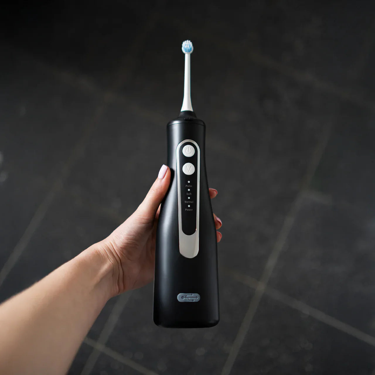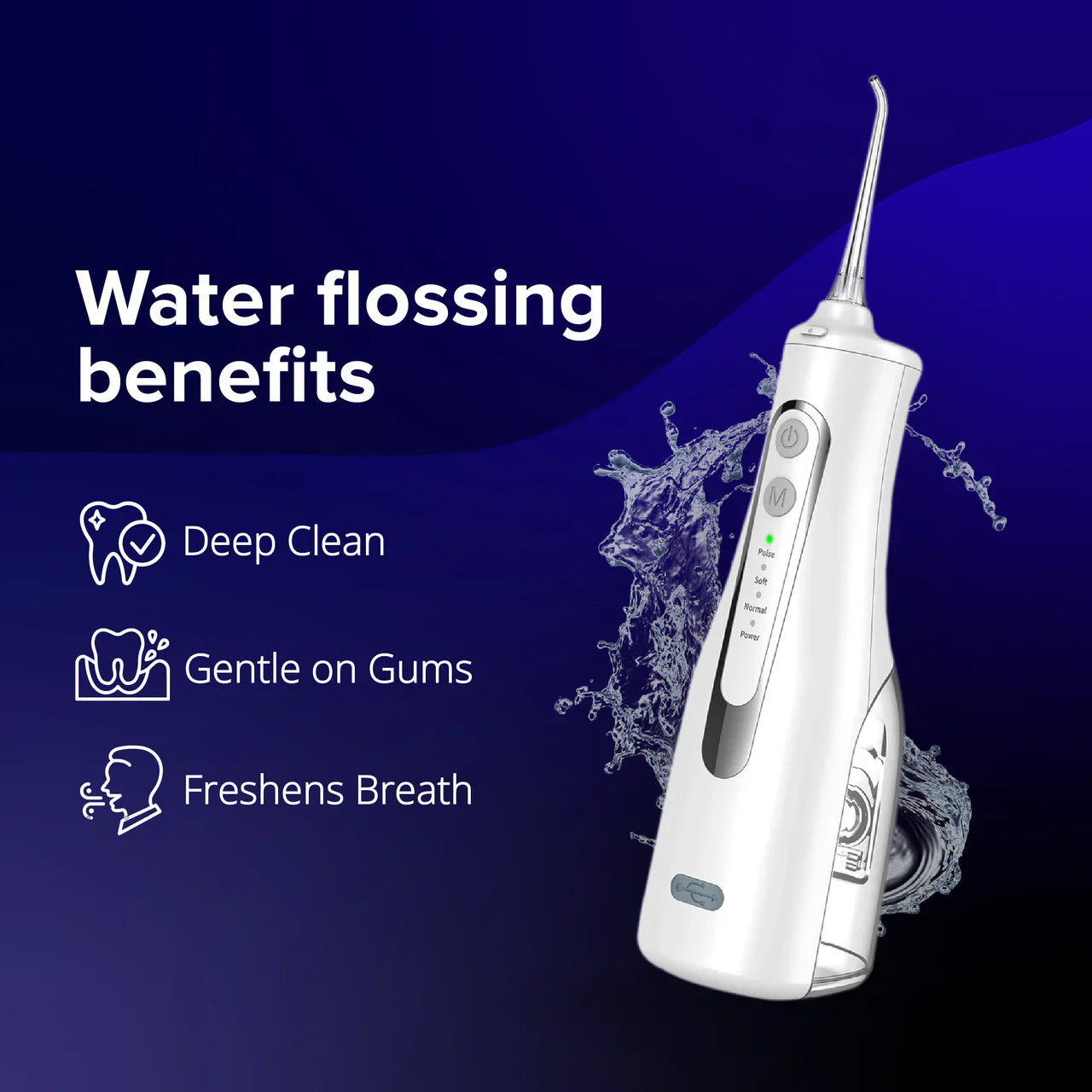 Key Features-3 modes provide a wide range ofintensity options (30-100 PSl),5 replaceable nozzles(including a tongue scraper nozzle),60-second flossing time, lPX6 waterproof foruse, universal USB cable, silent design.